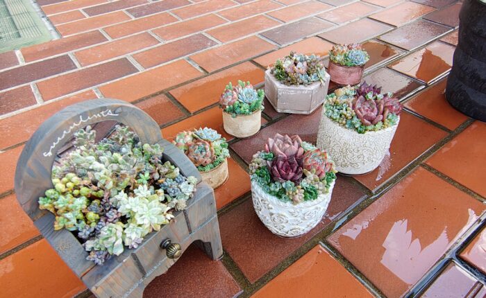 寄せ植えの水やりについては、セダムが入っていたり、サボテンを入れたりと種類によってお水やり頻度が異なるので状態の維持がとても難しいですね。